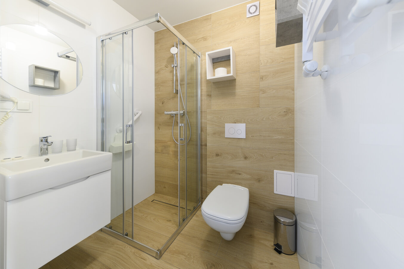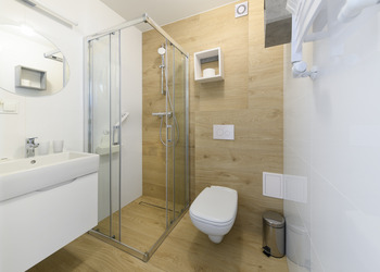 W budynku głównym A mieści się również recepcja, jadalnia, kawiarnia, baza zabiegowa, kompleks basenowy i salka fitness.